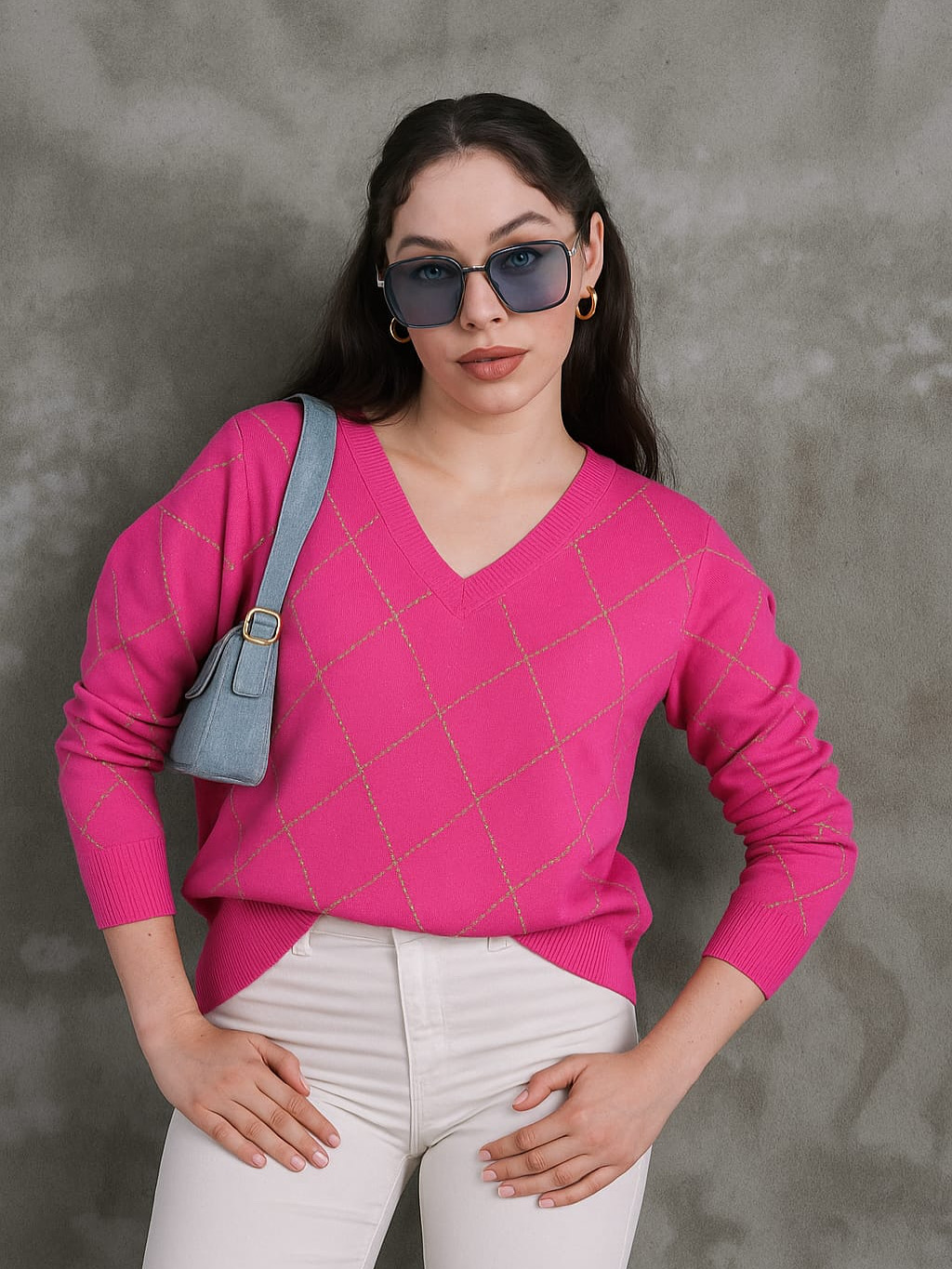 بلوزة ربيعية بخطوط مربعة ذهبية باللون الزهري