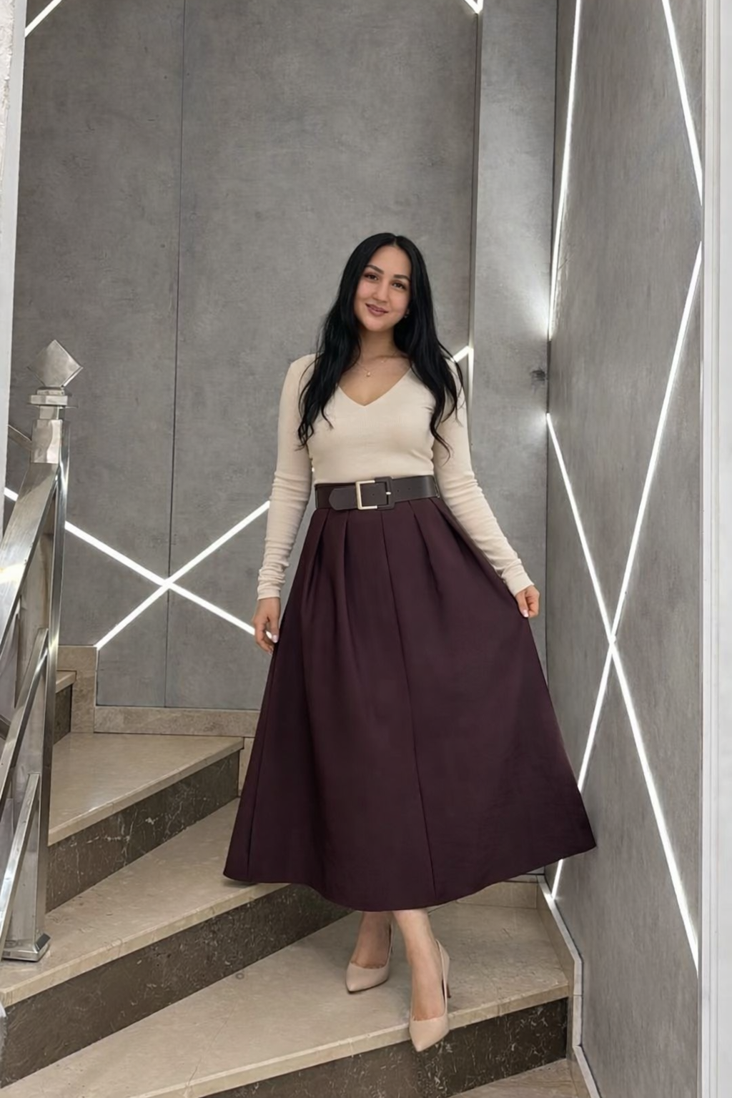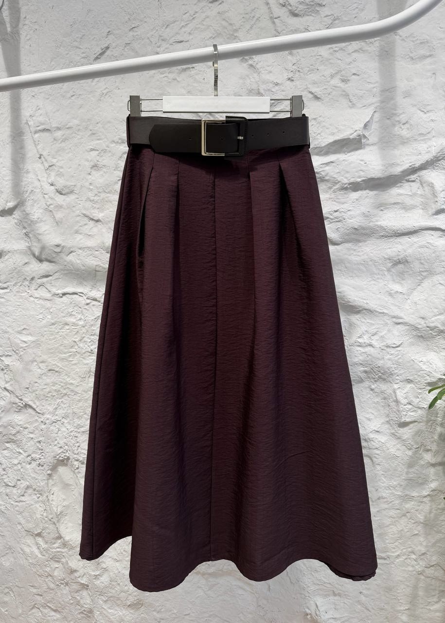 تنورة باللون العنابي مع قشاط بني