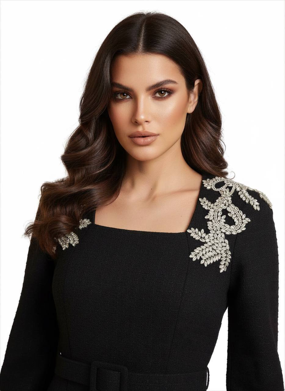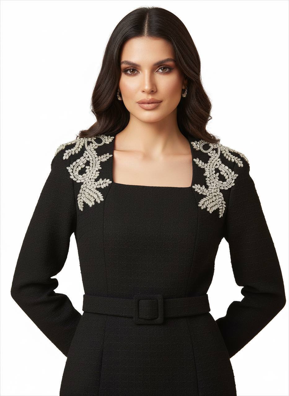 فستان أسود قماشة ثقيلة كتف كريستال